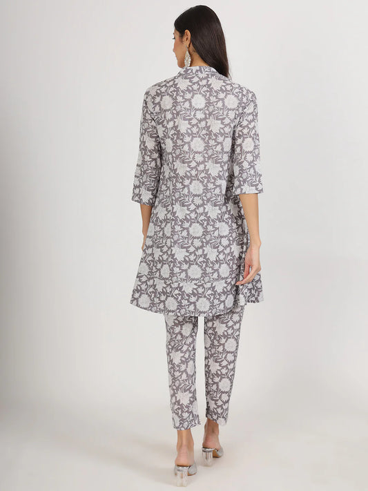 Grey Cotton Floral Print Ethnic Casual Co-ord Set