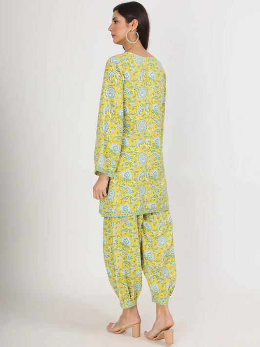 Rayon & Velvet Mustard Floral Print Co-ord Set