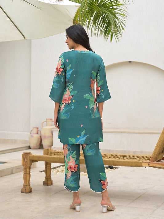 Bottle Green Ethnic Viscose Rayon Floral Print Co-ord Sets