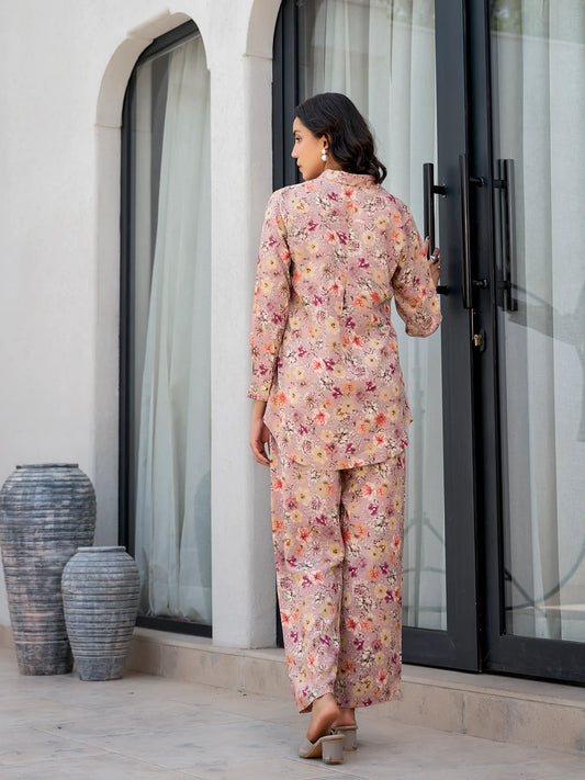 Beige Cotton Floral Printed Casual Co-ord Set