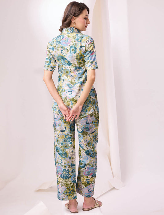 Green Floral Printed Muslin Casual Co-ord Set