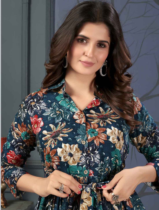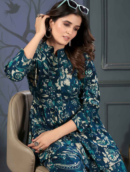 Blue Floral Print Viscose Rayon Casual Ethnic Co-ord Sets