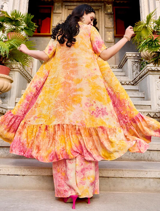 Yellow Blue Silk Full Stitched Koti Style Luxurious Co-ords Sets And Palazzo Printed Work