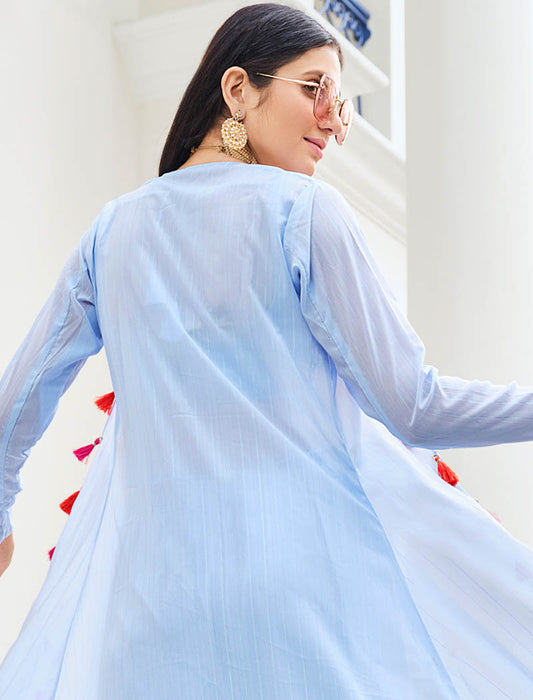 Sky Blue Silk Full Stitched Koti Style Luxurious Co-ords Sets And Palazzo Printed Work