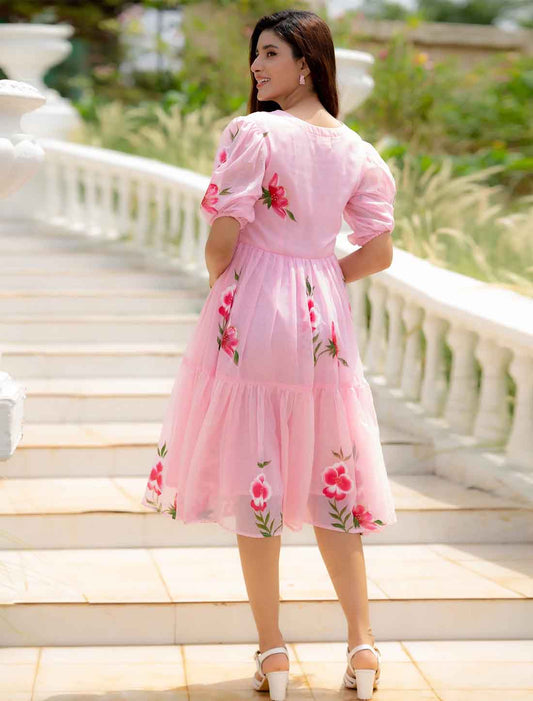 Rayon Light Pink A-Line Floral Printed Party Wear Midi Dress