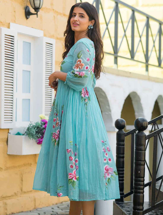 Rayon Teal Blue A-Line Floral Printed Party Wear Midi Dress