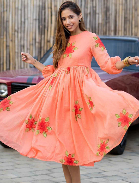 Elevate Peach Kota Checks With Digital Printed Short Western Dress