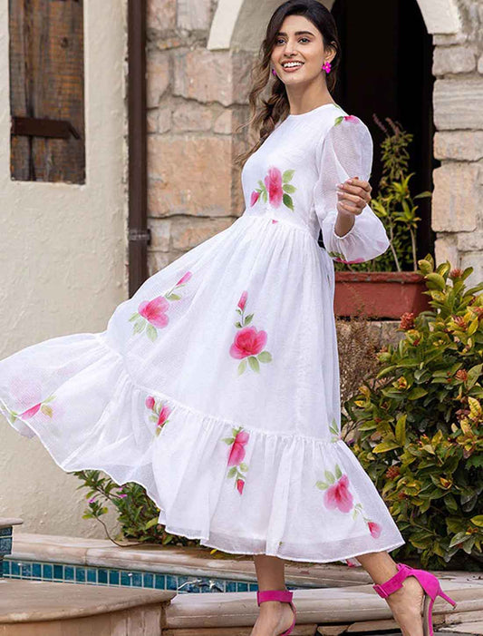 Party Wear Rayon White A-Line Floral Printed Midi Dress