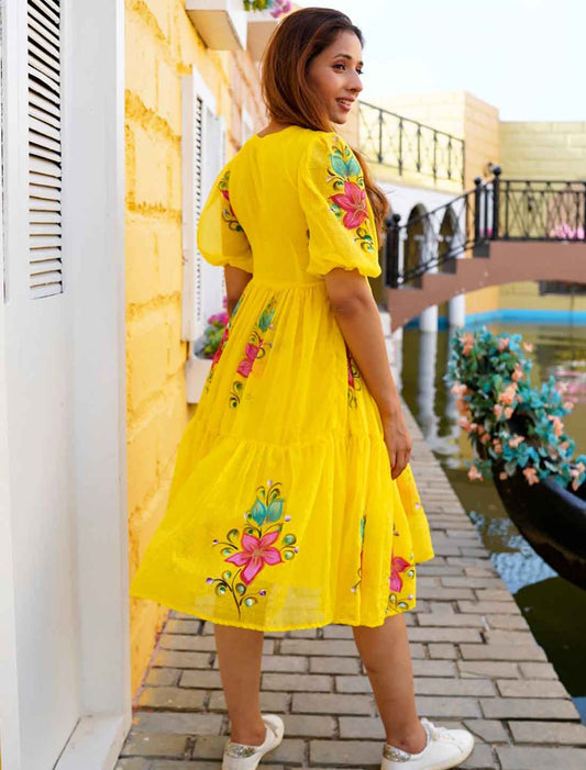 Elevate Yellow Weatren Kota Checks With Digital Printed Dress