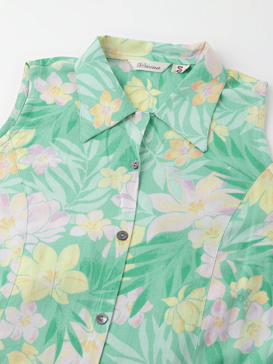 Green Floral Printed Rayon A-Line Midi Dress Party Wear for Women