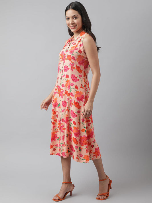 Party Wear Rayon Peach A-Line Floral Printed Midi Dress