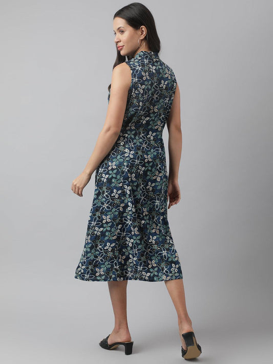 Rayon Navy Blue A-Line Floral Printed Party Wear Midi Dress