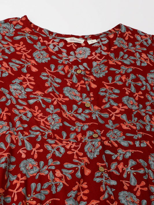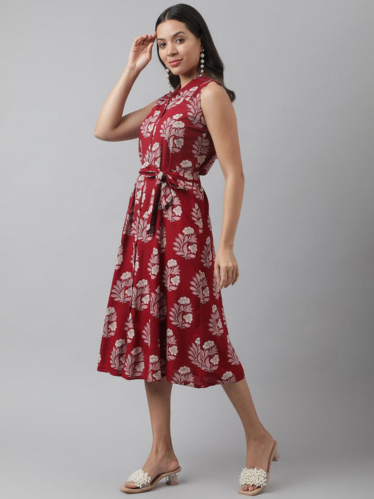 Party Wear Rayon Maroon & Pink A-Line Floral Printed Midi Dress