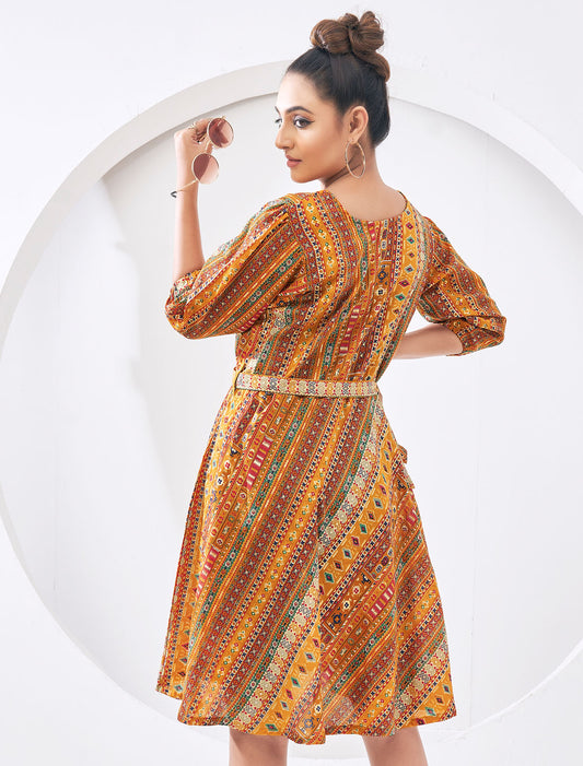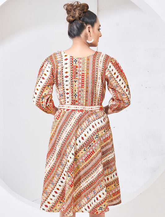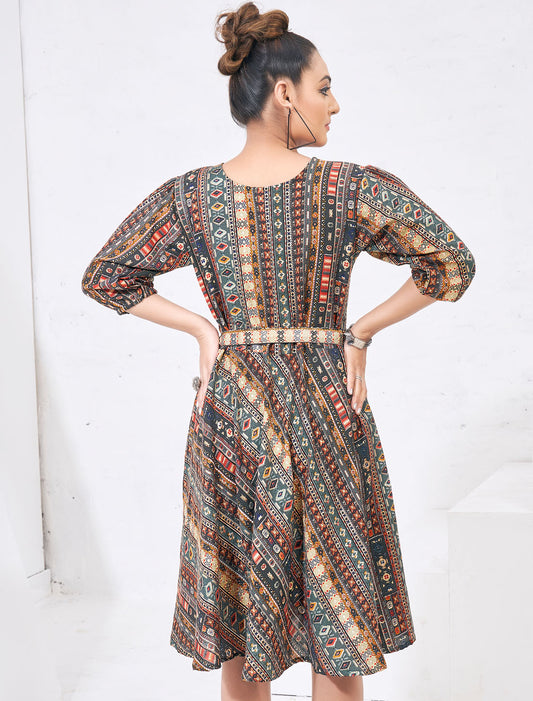 Blue Ethnic Motifs Print A-Line Party Wear Dress For Women