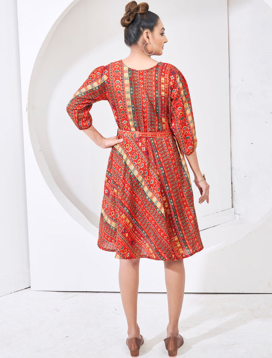 Red Floral Printed Cotton Ethnic Tiered Party Wear Dress