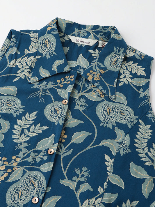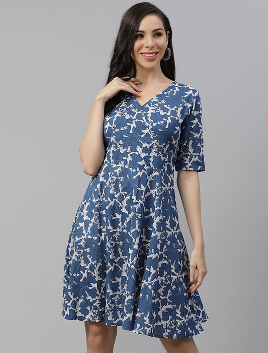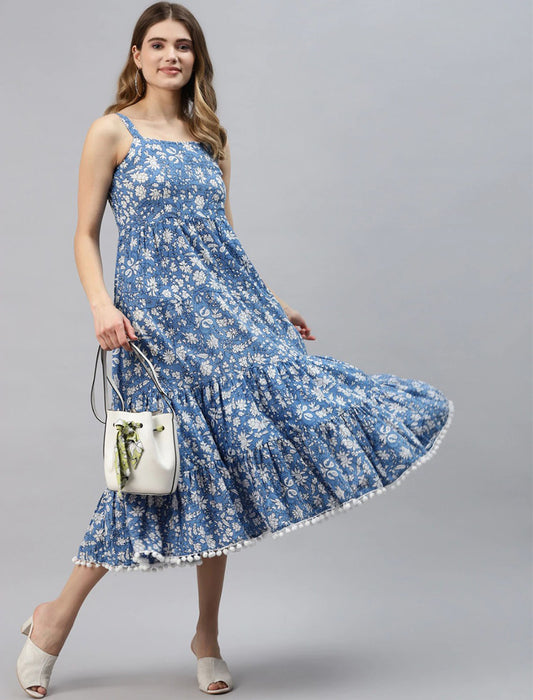 Blue Floral Print Rayon A-Line Midi Dress Party Wear for Women