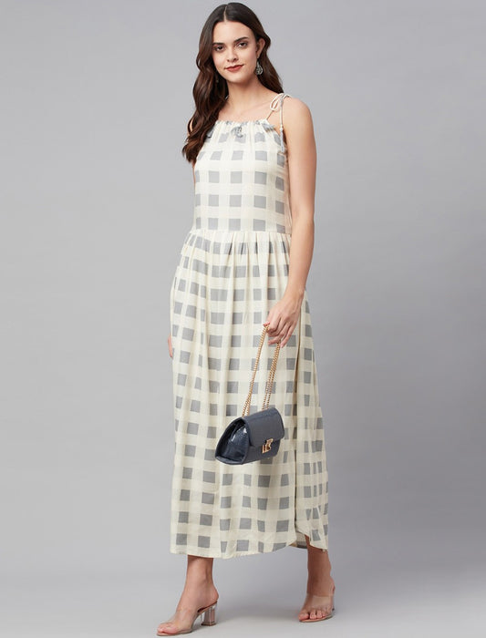 Party Wear Off White & Grey Checked Midi Dress For Women