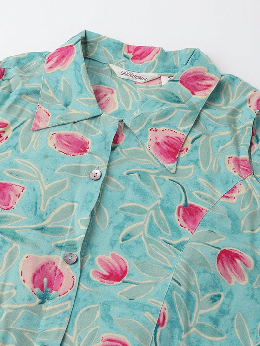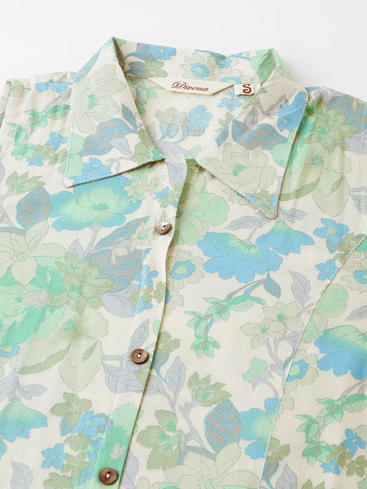 Green Floral Print Rayon A-Line Midi Dress Party Wear for Women