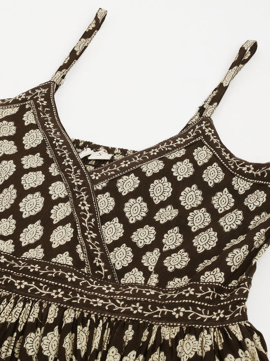 Floral Printed Cotton Empire Brown Party Wear Dress for Women