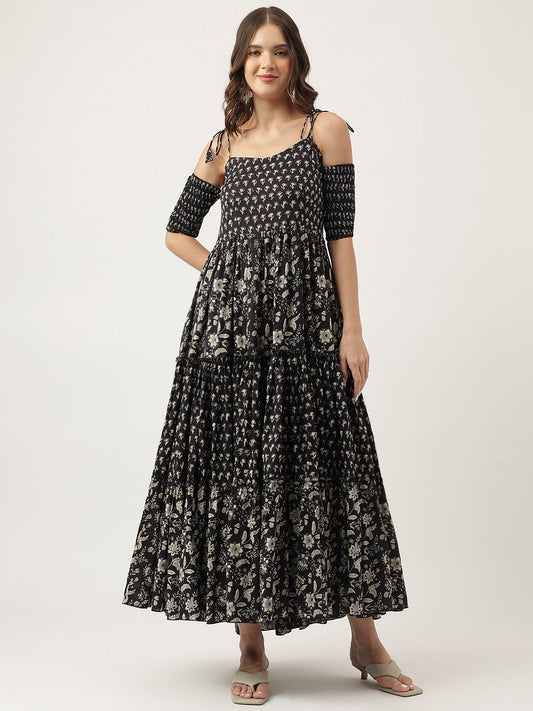 Floral Printed Cotton Cold Shoulder Tiered Party Wear Dress