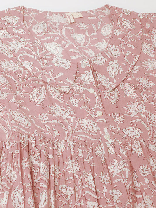 Pink Floral Printed Cotton Ethnic Party Wear Dress for Women