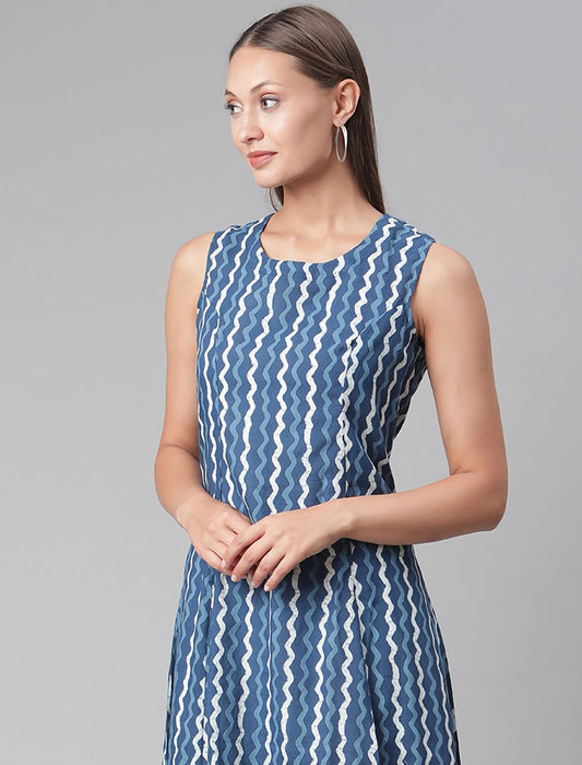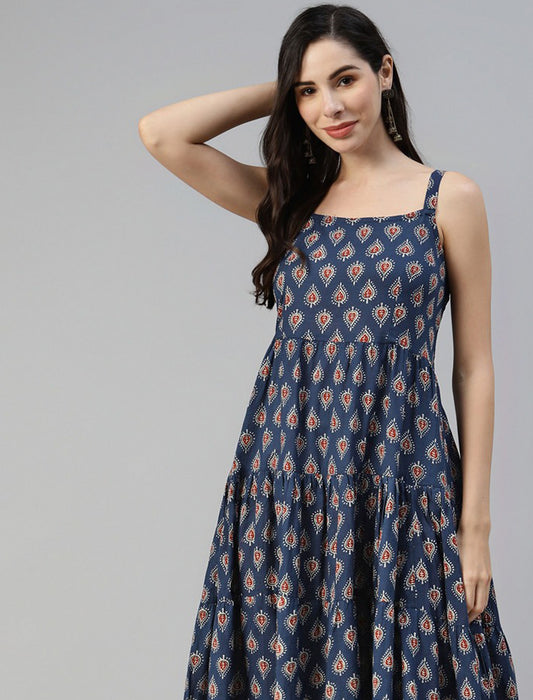 Navy Blue Ethnic Motifs Cotton Midi Party Wear Dress For Women