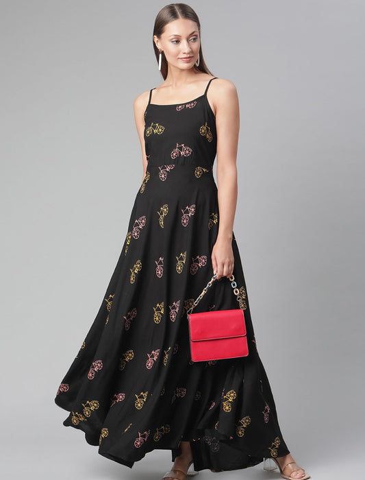 Party Wear Black Floral Shoulder Strap Maxi Dress