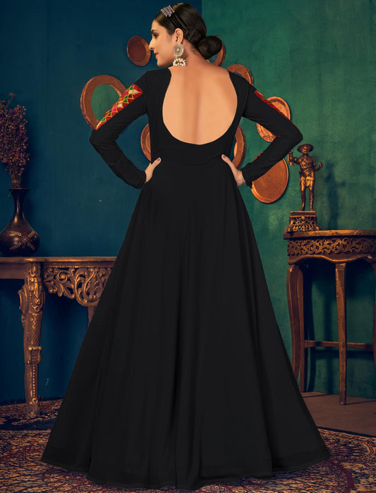 Designer Black Georgette Anarkali Ethnic Long Gown with Embroidery and Waist Belt