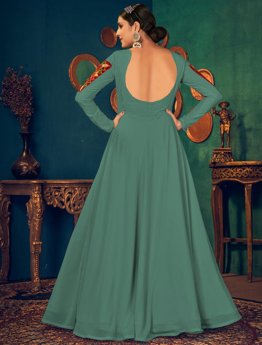 Designer Pista Green Anarkali Long Ethnic Gown with Embroidered Mirror and Pearl Work