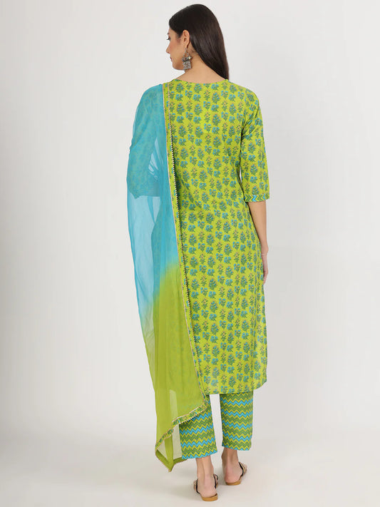 Green Floral Print Cotton Straight Ethnic Kurta Set
