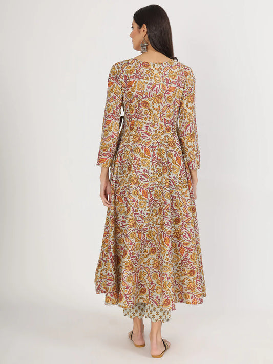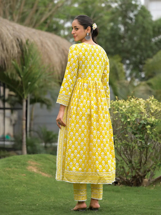 Yellow Cotton Floral Print Nyra Cut Ethnic Kurta Sets