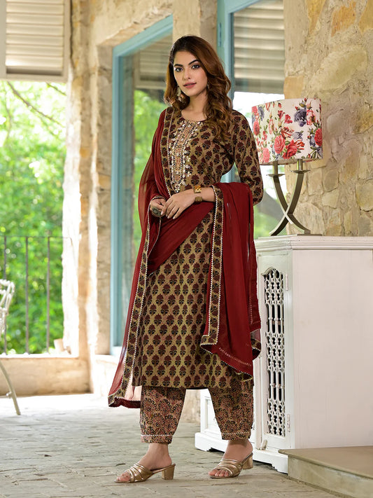 Brown Cotton Embroidered Ethnic Motif Print Kurta Sets