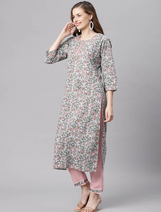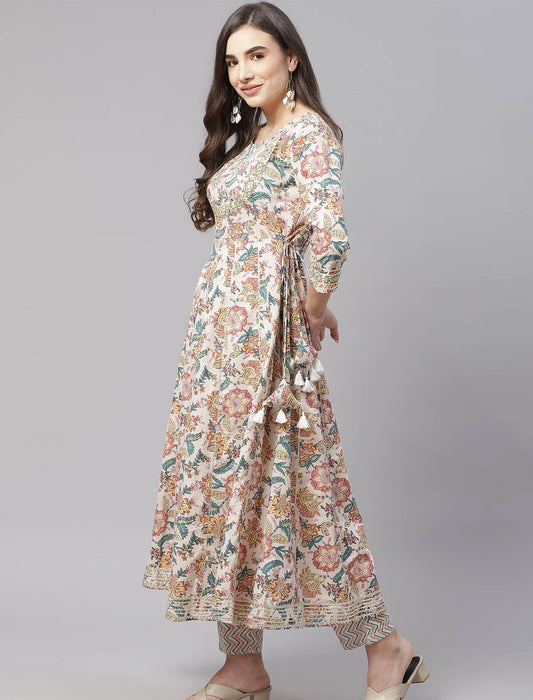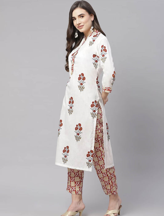 White Floral Printed Kurta with Trousers & Dupatta For Women