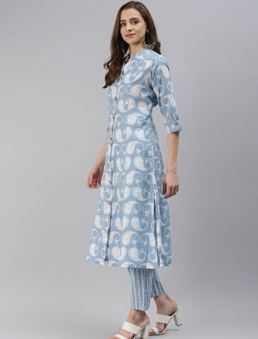 Blue Floral Printed Divena Kurta with Trousers & Dupatta For Women