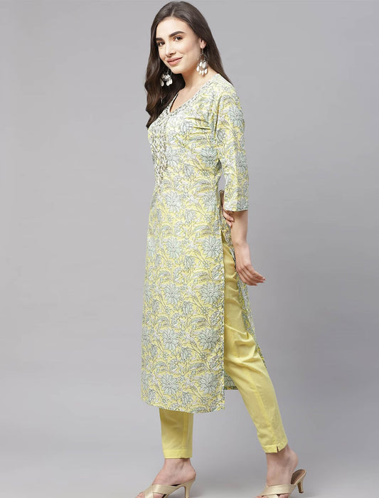 Yellow Floral Printed Kurta with Trousers & Dupatta For Women
