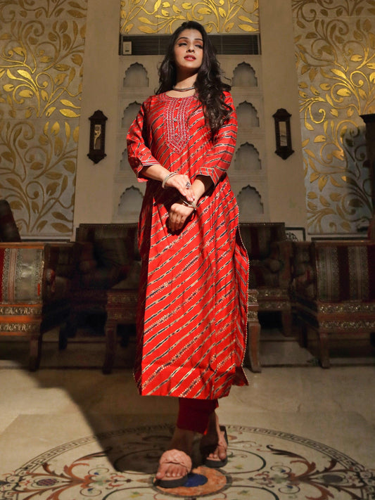 Red Lahariya kurta with Cotton Flex Pant set For Women