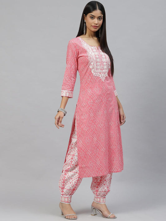 Pink Bandhani Printed Kurta Pant Set with Dupatta For Women