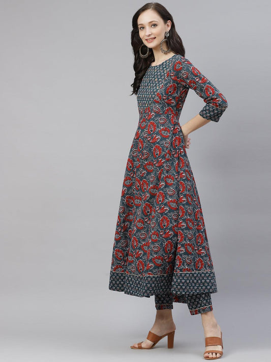 Navy Cotton Paisley Print Kurta Hem Cuffed Pant Set For Women