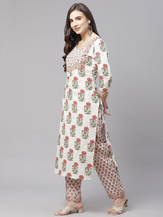 White Hand Block Floral Print Cotton Women Kurta, Trouser With Dupatta