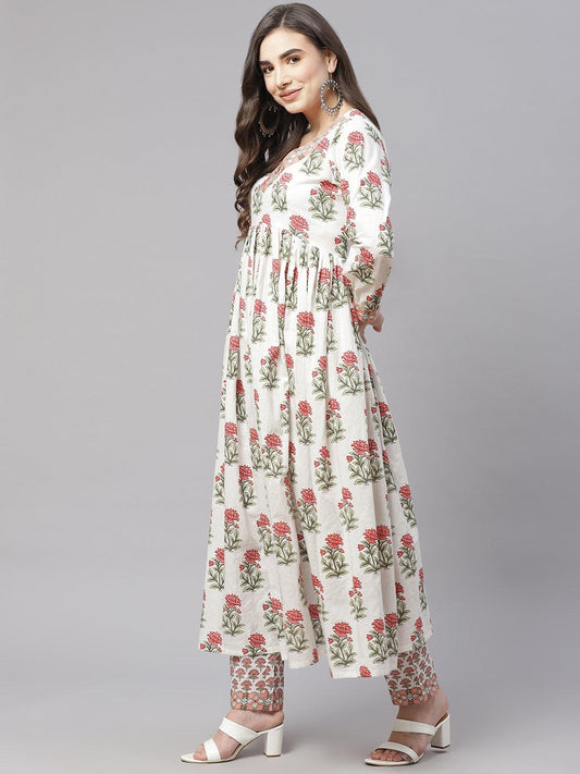 Ethnic White Handblock Floral Printed Cotton Anarkali Kurta Set with Kota Doria Dupatta