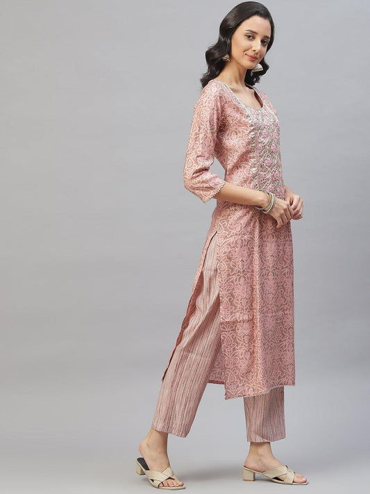 Pink hand block Floral Printed Cotton Kurta Set For Women, trousers with Dupatta Set