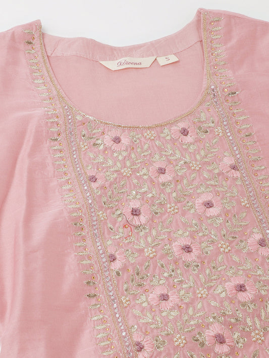 Pink Embroidered Chanderi Kurta with trouser & Organza Dupatta