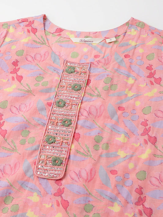 Pink Floral Print Cotton Kurta Set For Women, Trouser With Dupatta