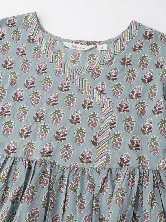Ethnic Sky Blue Hand Block Floral Print Cotton Kurta, Trouser