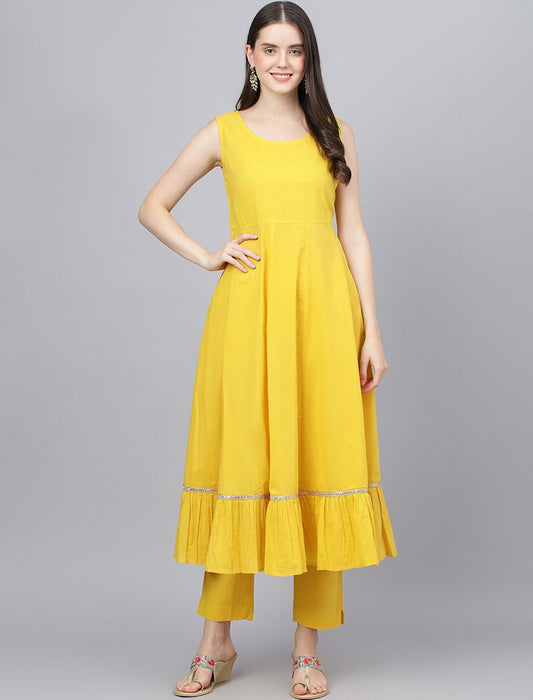 Yellow Ethnic Cotton kurta Sets with Trousers & Dupatta