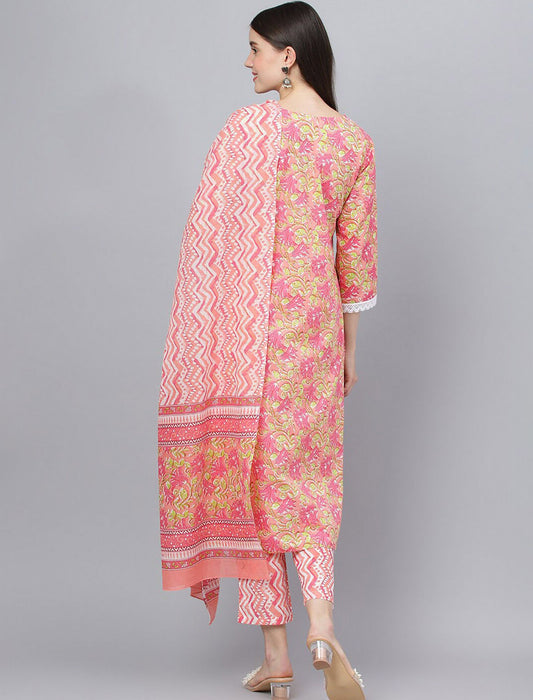 Pink Ethnic Printed Cotton Kurta Pant Sets with Dupatta