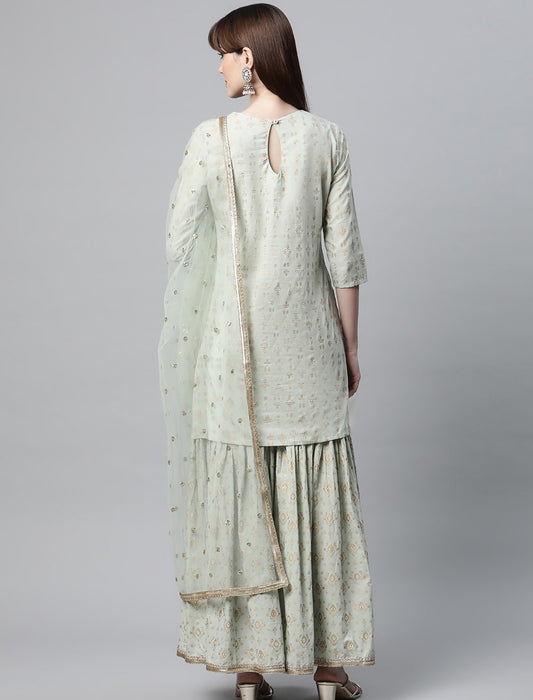 Sea Green Ethnic Motifs Printed Cotton Kurta with Sharara & Dupatta Kurta Sets For Women