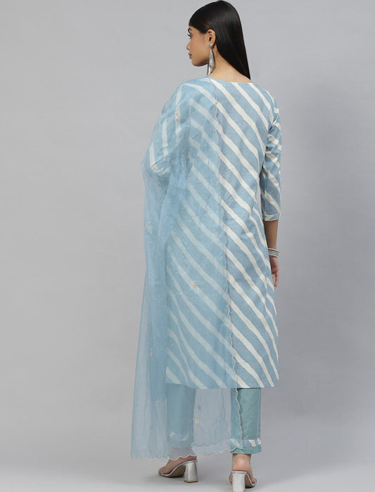Blue Leheriya Printed Ethnic Kurta Pant Set With Organza Dupatta