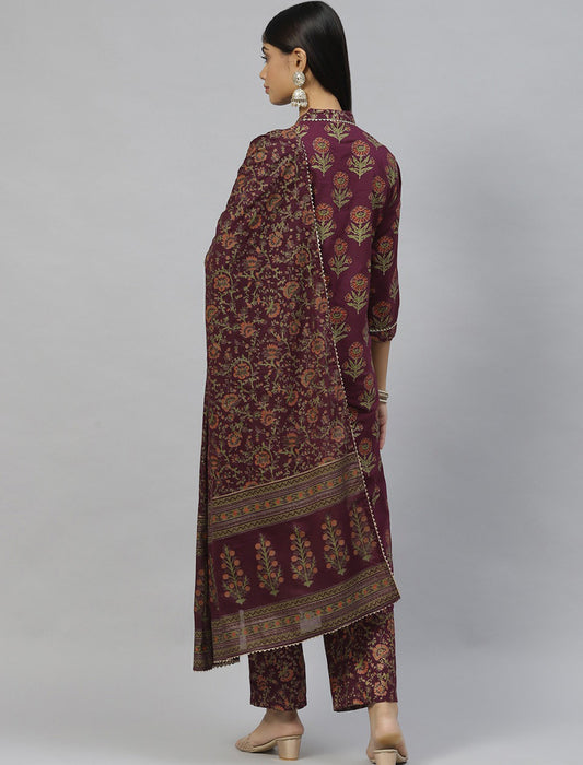 Ethnic Purple Cotton Straight Kurta Pant Set with Dupatta