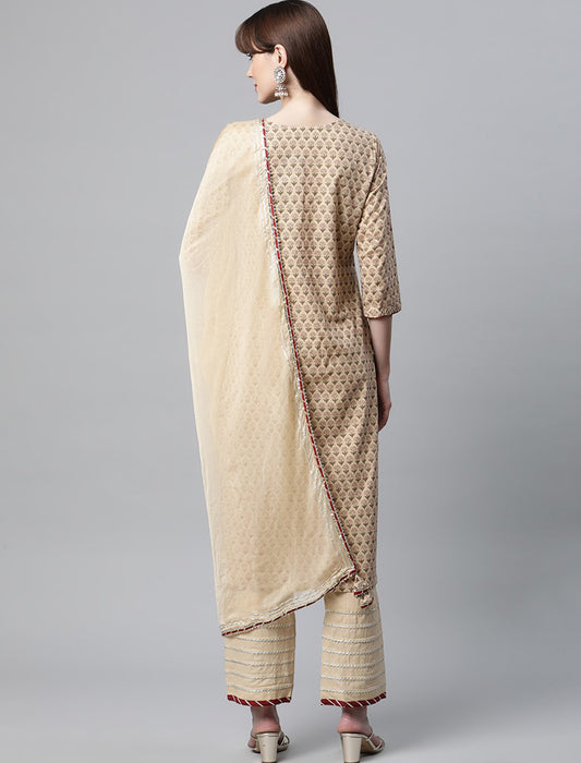 Cream Ethnic Women Chanderi Silk Kurta Set with Dupatta